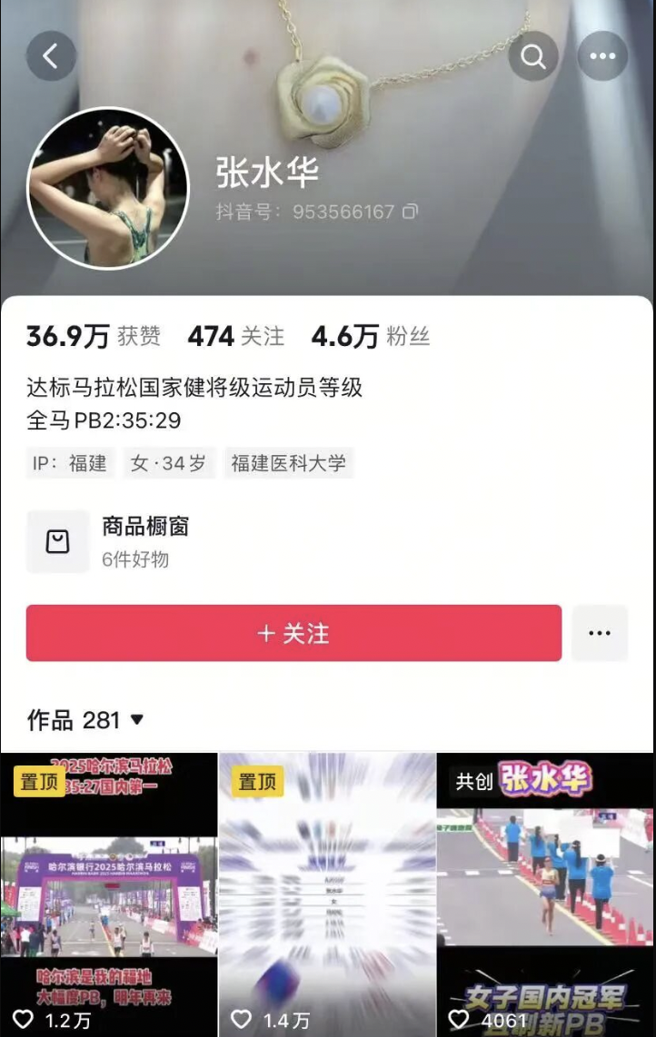 此前张水华的短视频账号主页上标注:达标马拉松国家健将级运动员等级;路跑签约品牌361度;2023/2025哈尔滨马拉松女子全程国内第一。不过目前,张水华的社交账号上已删除与361度签约的相关内容。